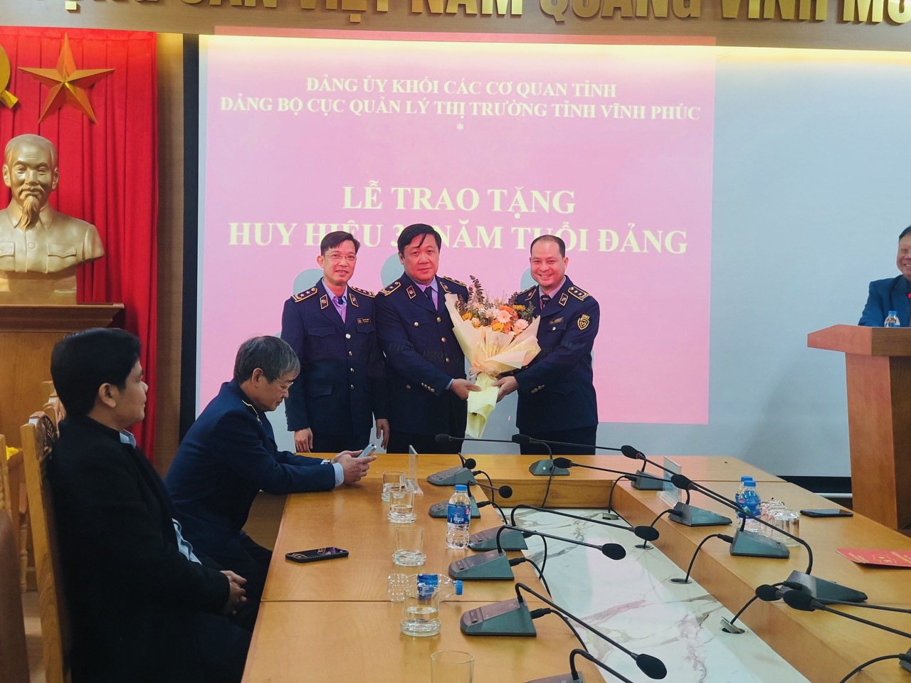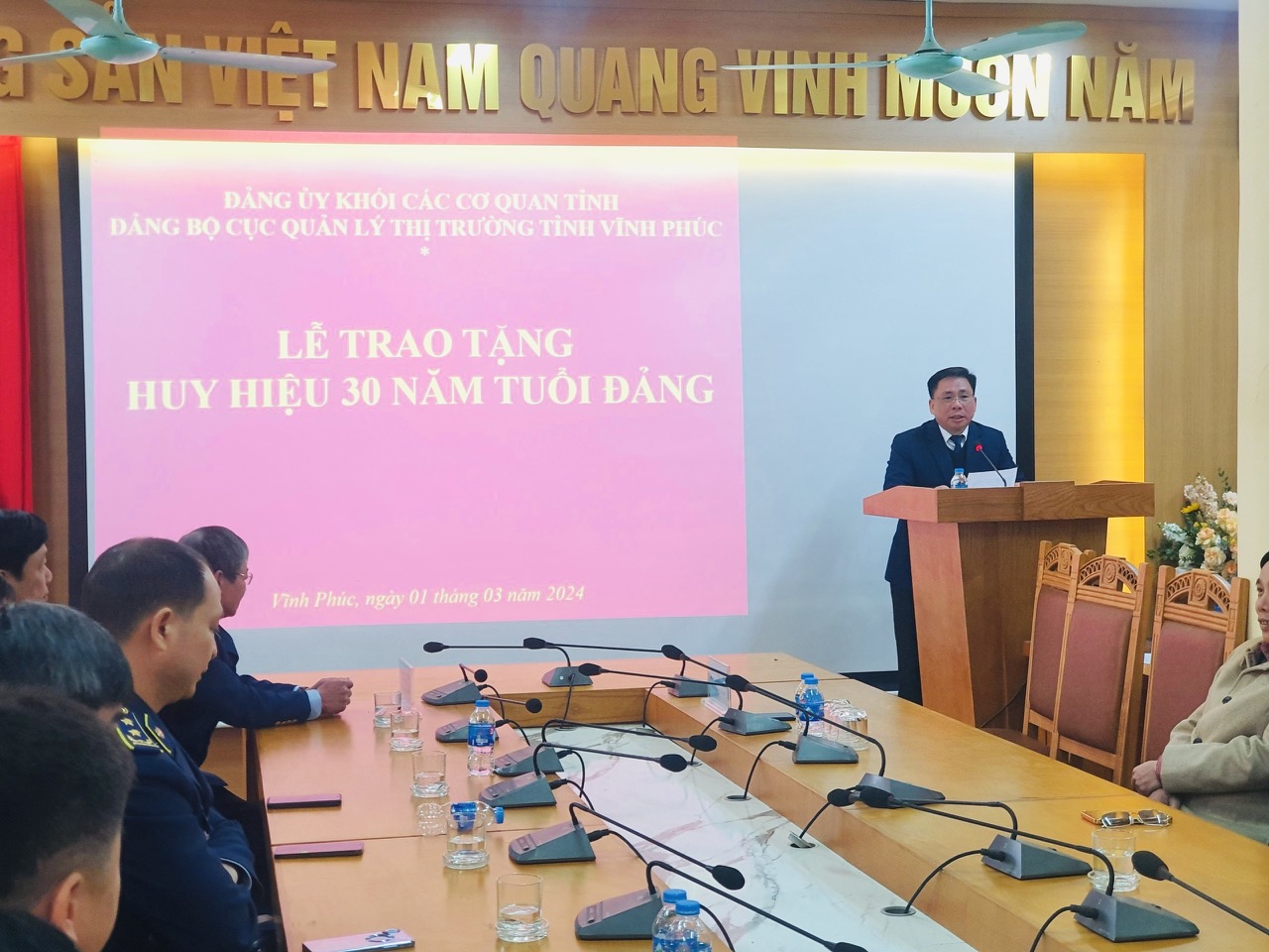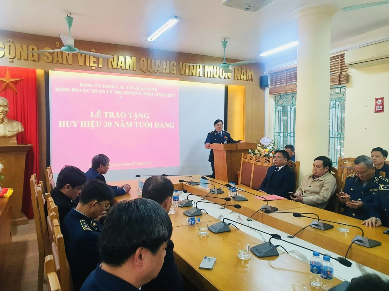 Ngày 01/3/2024, Đảng ủy Cục Quản lý thị trường tỉnh Vĩnh Phúc đã tổ chức trao tặng Huy hiệu 30 năm tuổi đảng cho đảng viên. Dự buổi lễ trao tặng Huy hiệu đảng có đồng chí Vũ Ngọc Vinh, Phó Bí thư thường trực Đảng ủy Khối các cơ quan tỉnh; Đồng chí Hoàng Phương, Bí thư Đảng ủy, Cục trưởng Cục Quản lý thị trường tỉnh Vĩnh Phúc và các đồng chí ủy viên Đảng ủy Cục, tập thể lãnh đạo Cục; Bí thư, Phó Bí thư các chi bộ trực thuộc Đảng bộ Cục; Trưởng phòng chuyên môn, nghiệp vụ; Đội trưởng các Đội Quản lý thị trường.