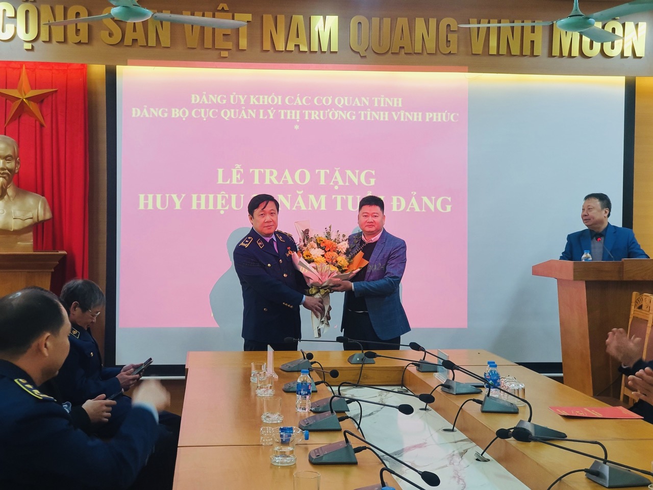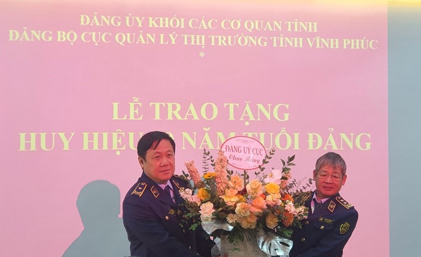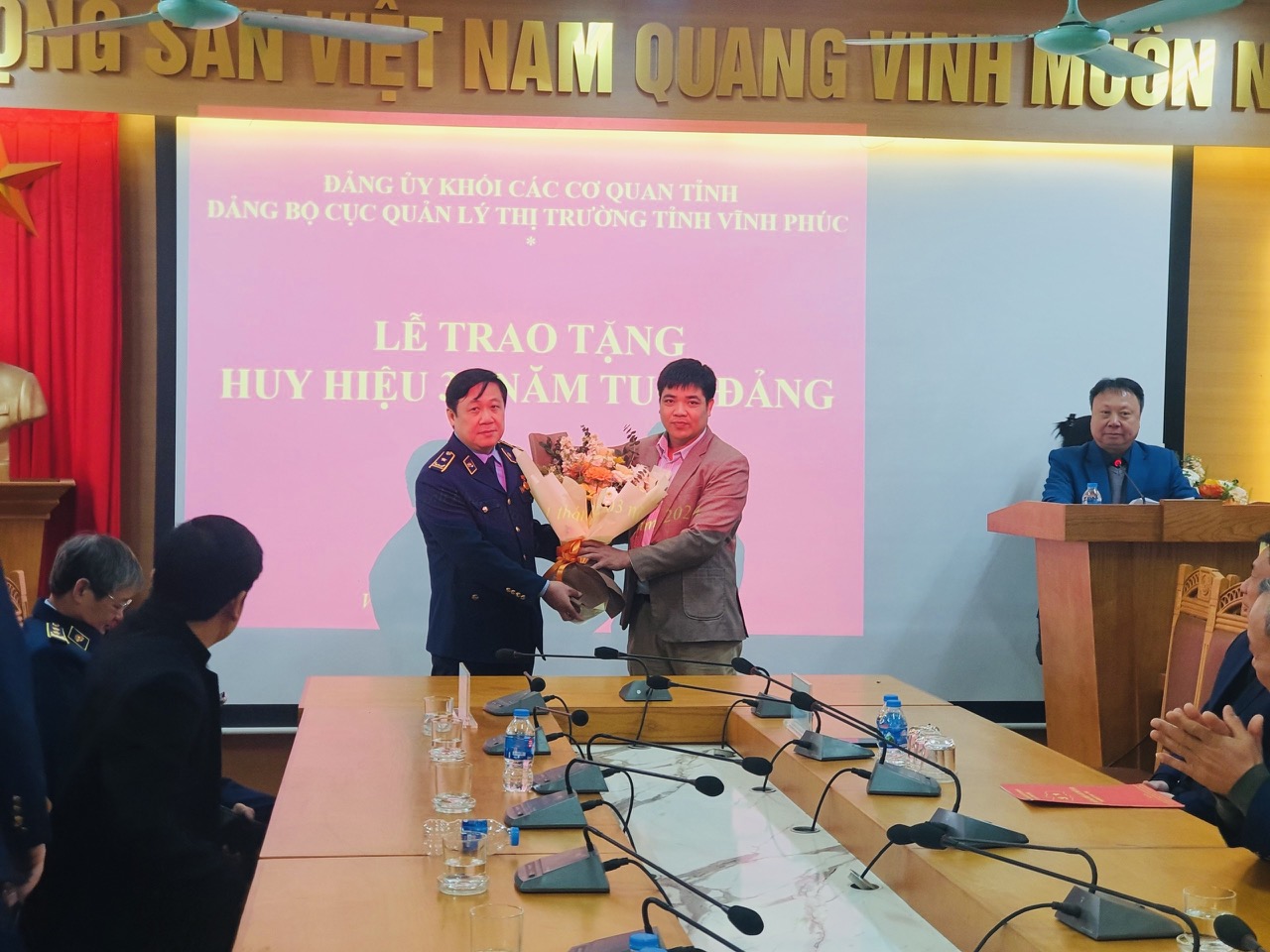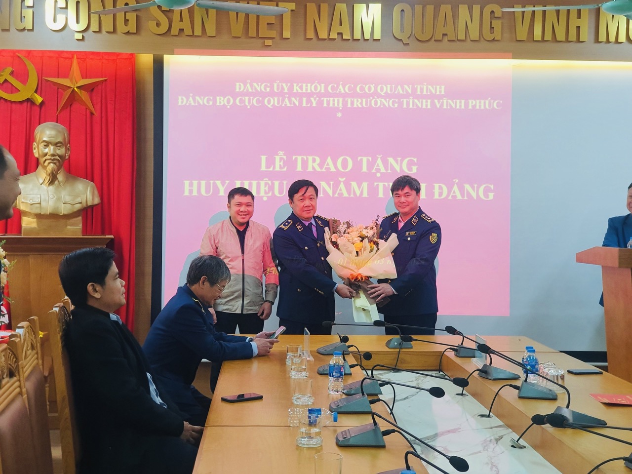 Ngày 01/3/2024, Đảng ủy Cục Quản lý thị trường tỉnh Vĩnh Phúc đã tổ chức trao tặng Huy hiệu 30 năm tuổi đảng cho đảng viên. Dự buổi lễ trao tặng Huy hiệu đảng có đồng chí Vũ Ngọc Vinh, Phó Bí thư thường trực Đảng ủy Khối các cơ quan tỉnh; Đồng chí Hoàng Phương, Bí thư Đảng ủy, Cục trưởng Cục Quản lý thị trường tỉnh Vĩnh Phúc và các đồng chí ủy viên Đảng ủy Cục, tập thể lãnh đạo Cục; Bí thư, Phó Bí thư các chi bộ trực thuộc Đảng bộ Cục; Trưởng phòng chuyên môn, nghiệp vụ; Đội trưởng các Đội Quản lý thị trường.