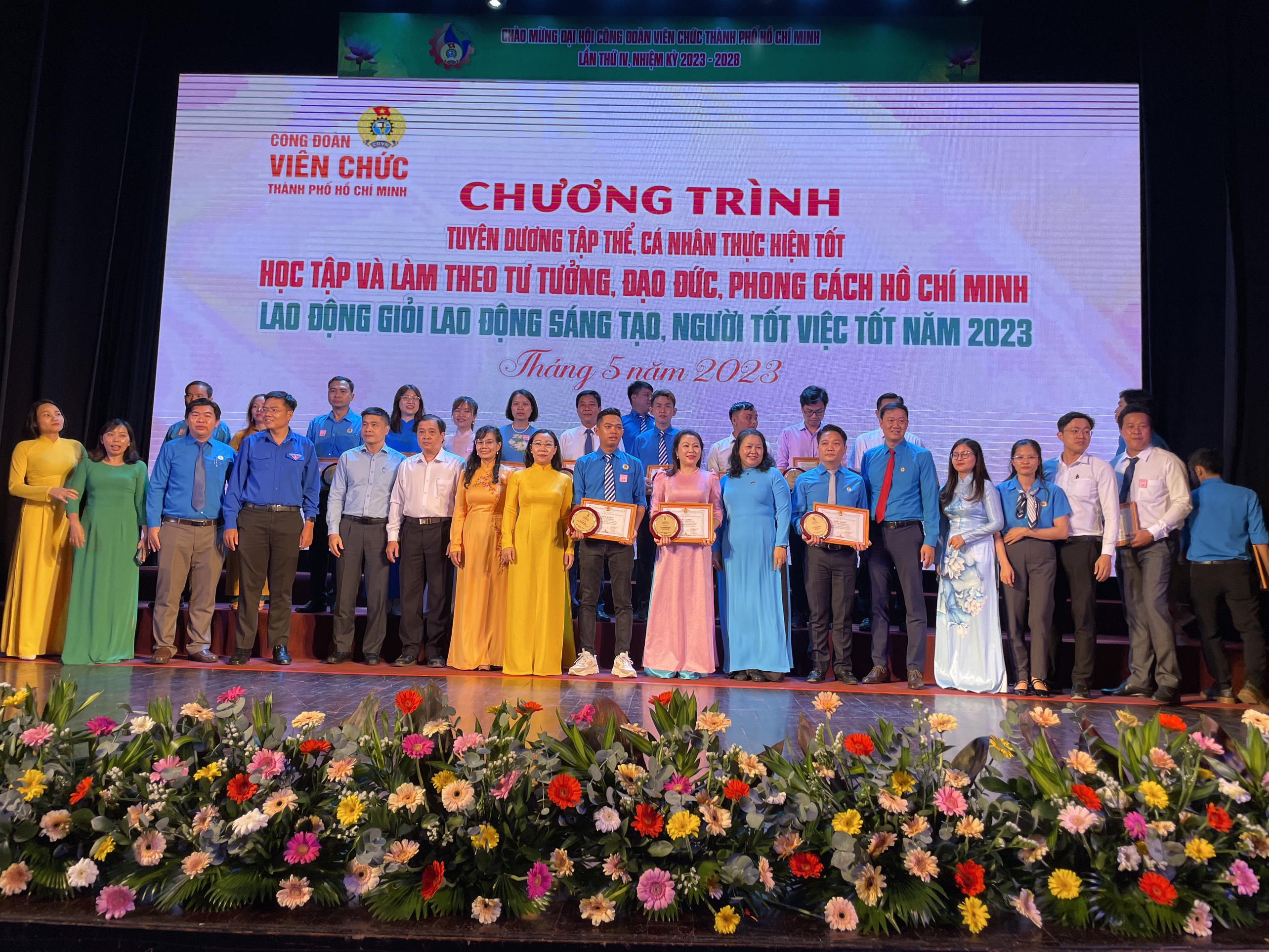 Cùng chiều cùng ngày 19/5/2023 tại Nhà Văn hóa Thanh niên, nhằm thiết thực chào mừng Đại hội Công đoàn các cấp, tiến tới Đại hội Công đoàn Viên chức Thành phố Hồ Chí Minh nhiệm kỳ 2023 -2028, nhằm lan tỏa và nhân rộng các gương điển hình trong phong trào thi đua, đồng thời tạo không khí thi đua chào mừng đại hội công đoàn các cấp và tháng công chức, viên chức, người lao động năm 2023, Ban Thường vụ Công đoàn Viên chức TP. HCM tổ chức chương trình tuyên dương tập thể, cá nhân học tập và làm theo Bác; gương “ Lao động giỏi, lao động sáng tạo ”; gương “ Người tốt việc tốt ” năm 2023, ra mắt công trình thi đua chào mừng Đại hội Công đoàn các cấp nhiệm kỳ 2023 -2028; Chương trình “ Cảm ơn Người lao động ” năm 2023.