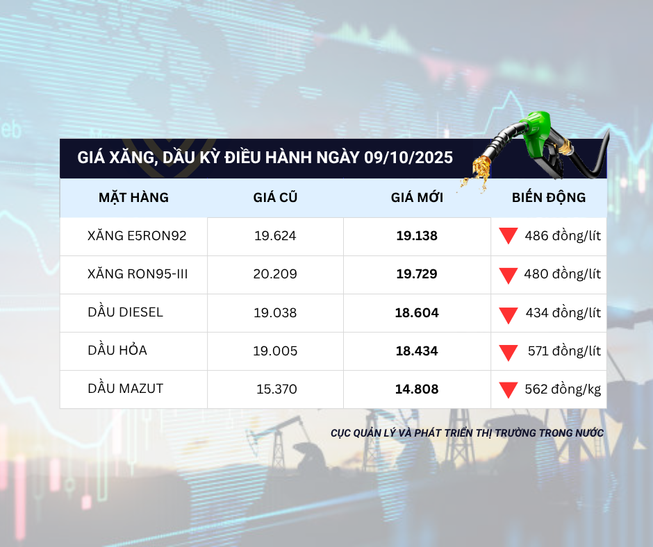 Trong kỳ điều hành này, liên Bộ Công Thương - Tài chính không thực hiện trích lập và không chi Quỹ Bình ổn giá xăng dầu đối với tất cả các mặt hàng. Theo đó, kể từ 15h00 ngày 09/10/2025, giá bán lẻ tối đa đối với các mặt hàng xăng dầu được áp dụng như sau: