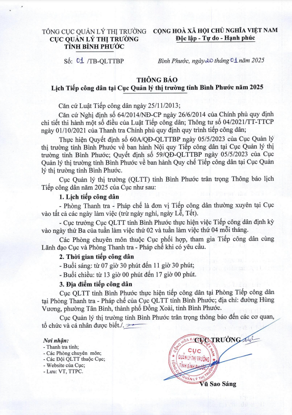 Cục Quản lý thị trường tỉnh Bình Phước trân trọng Thông báo lịch tiếp công dân năm 2025 của Cục như sau: