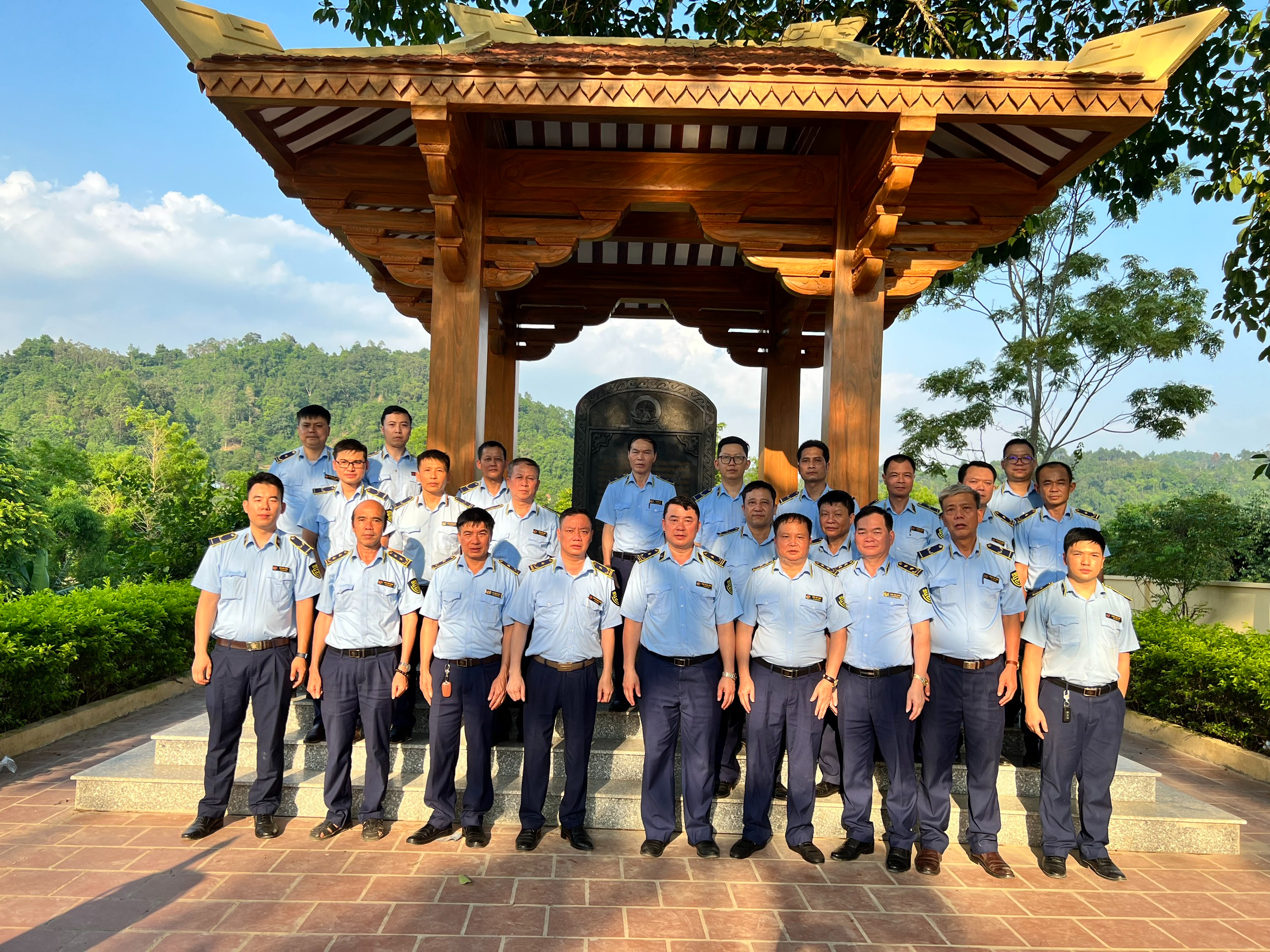 Cán bộ, đảng viên Chi bộ 3 chụp ảnh lưu niệm tại bia di tích lịch sở Đình Háng Pài, thôn Khòn Pheo, xã Thụy Hùng, huyện Cao Lộc, tỉnh Lạng Sơn, nơi thành lập Chi bộ Đảng đầu tiên của tỉnh Lạng Sơn